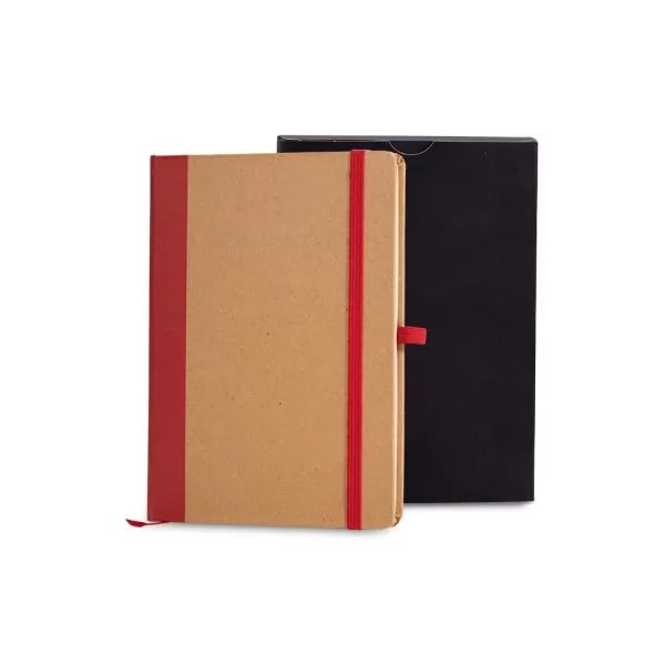 Caderno para anotações com capa dura nas cores Vermelho/Bege. Conta com 80 folhas não pautadas, marcador de página, porta caneta e elástico para fechamento. Gramatura da folha de 70 g/m2.