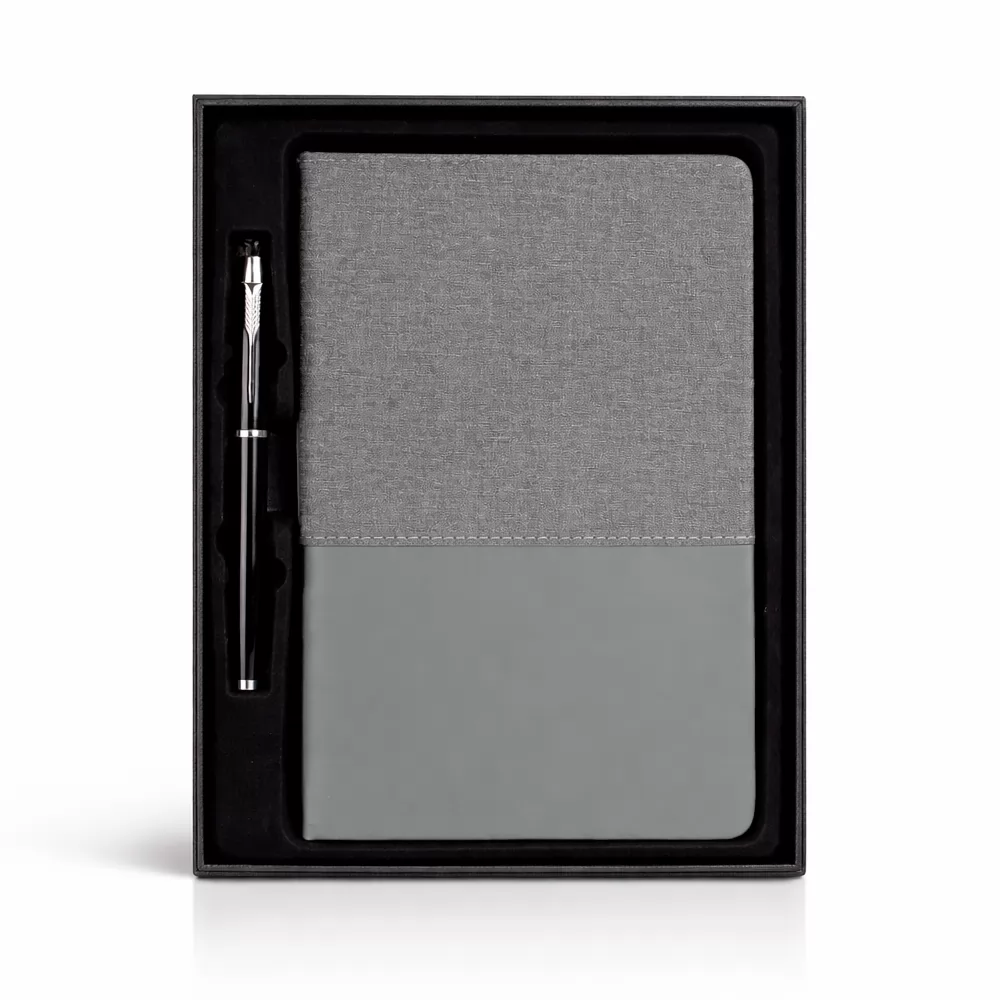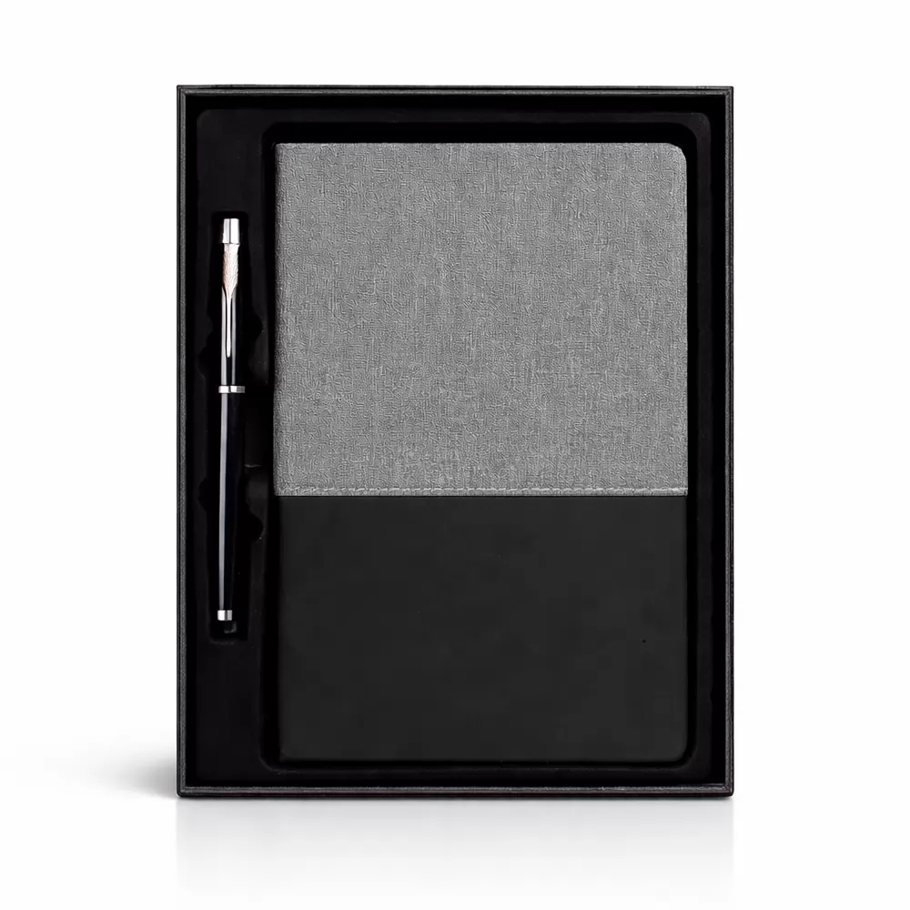 Kit executivo composto por dois itens: uma caderneta e uma caneta. A caderneta possui capa em PU, fecho em elástico, marca-páginas em fita de cetim e cerca de 80 folhas marfim pautadas. A caneta metálica possui ponta em plástico ABS e carga esferográfica preta de 0,8 mm. Acompanha caixa em papelão com berço em PET com revestimento aveludado para acomodação dos itens.